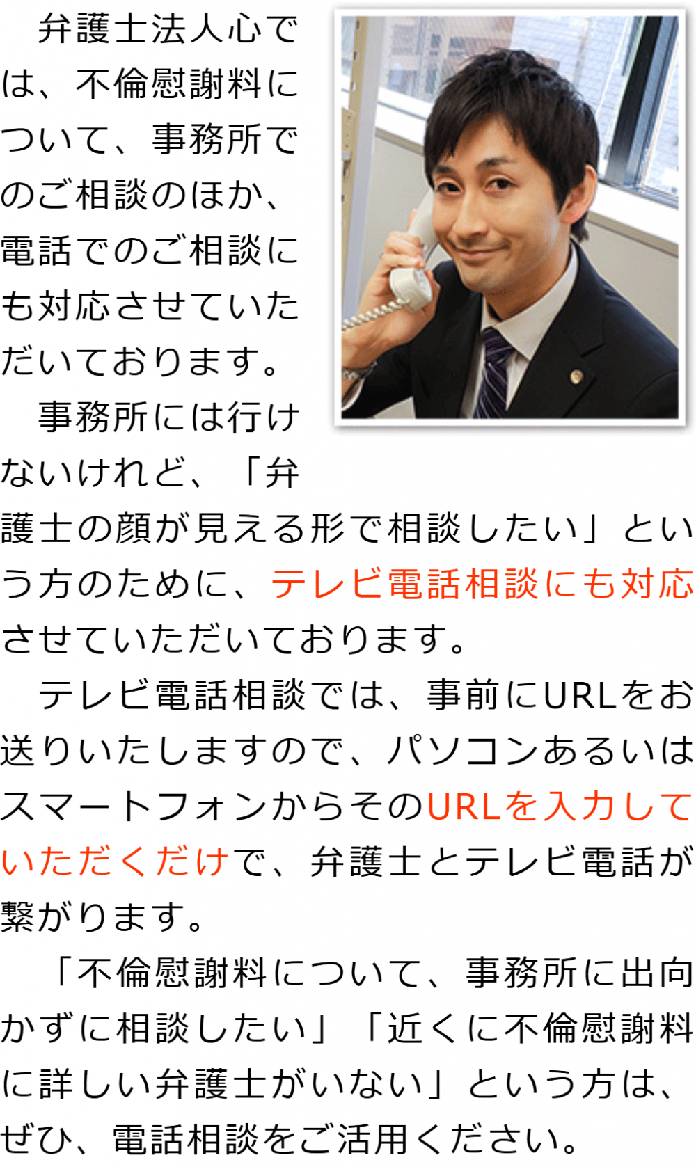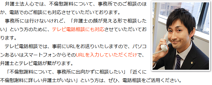 トップその他電話相談・テレビ電話相談について 階層構造▼ その他(目次) 電話相談・テレビ電話相談について その他(目次)その他トップ共通バナー元※削除不可心グループニュース(新着情報)弁護士・スタッフ選ばれる理由お役立ち情報・Q&Aお役立ち情報不倫の慰謝料請求の時効事実婚における不倫の慰謝料請求Q&A不倫慰謝料の求償権に関するQ&A電話相談・テレビ電話相談について代表メッセージプライバシーポリシー 受付時間 平日 9時~21時、土日祝 9時~18時 夜間・土日祝の相談も対応します (要予約) 所在地 〒286-0033 千葉県成田市花崎町801-1京阪成田ビル6F 0120-41-2403 お問合せ・アクセス・地図