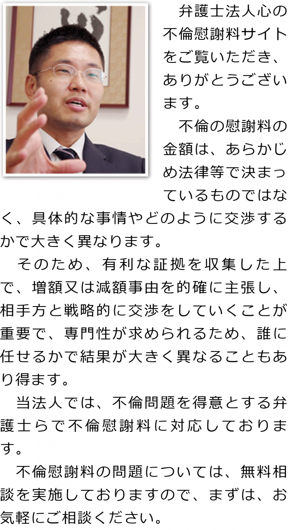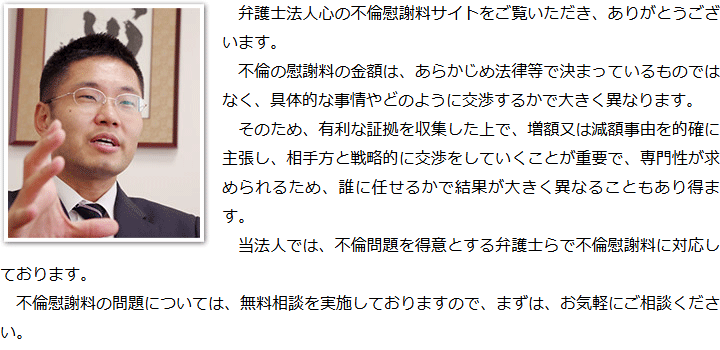 トップその他代表メッセージ 階層構造▼ その他(目次) 代表メッセージ その他(目次)その他トップ共通バナー元※削除不可心グループニュース(新着情報)弁護士・スタッフ選ばれる理由お役立ち情報・Q&Aお役立ち情報不倫の慰謝料請求の時効事実婚における不倫の慰謝料請求Q&A不倫慰謝料の求償権に関するQ&A電話相談・テレビ電話相談について代表メッセージプライバシーポリシー 受付時間 平日 9時~21時、土日祝 9時~18時 夜間・土日祝の相談も対応します (要予約) 所在地 〒286-0033 千葉県成田市花崎町801-1京阪成田ビル6F 0120-41-2403 お問合せ・アクセス・地図